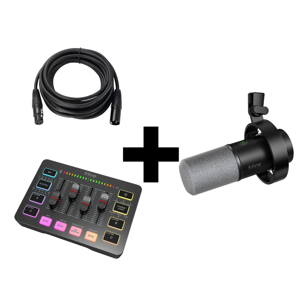 FIFINE K688 + SC3 Studio Bundle היא חבילה מושלמת לפודקאסטים, סטרימינג וגיימינג. היא כוללת את המיקרופון הדינמי K688 עם חיבור USB/XLR, את כרטיס הקול AmpliGame SC3 עם שליטה נפרדת על מיקרופון ואוזניות, וכבל חיבור – כדי שתוכלו להתחיל לשדר ולהקליט באיכות גבוהה כבר מהיום הראשון.